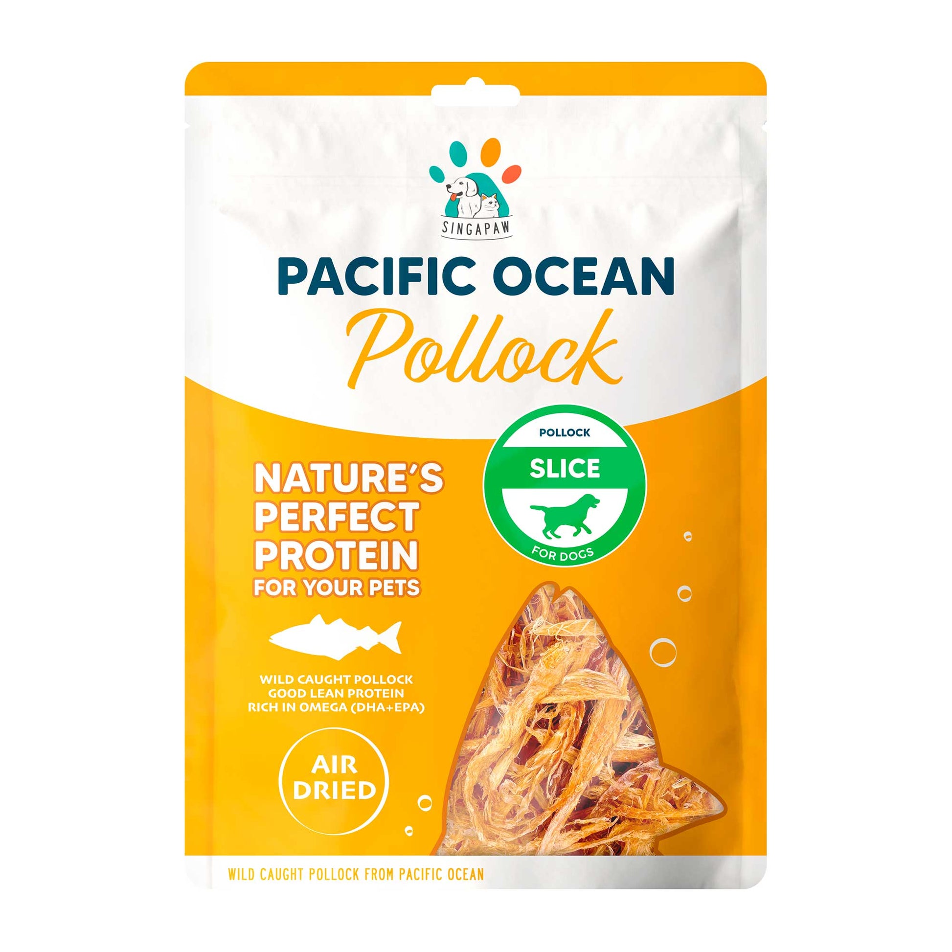 SINGAPAW Pacific Ocean Pollock Slice treats are made using fresh, sustainable, 100% wild-caught pollock from the Pacific Ocean, air-dried to retain its natural taste and nutritional value. They make a wonderful lean protein treat for your dogs, offering the mildly sweet taste and aroma of pollock whitefish.